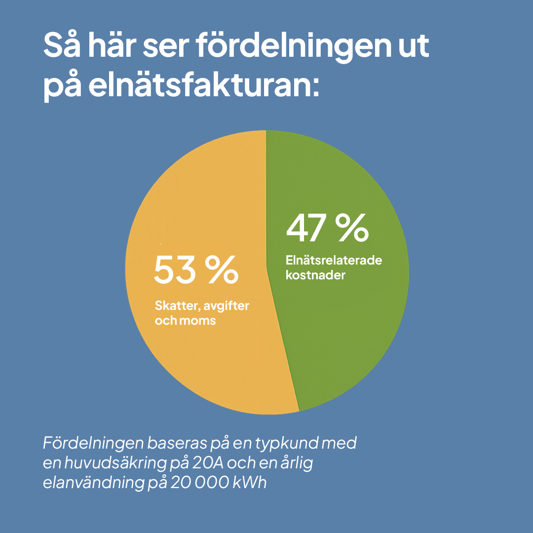 Baserat på en typkund med huvudsäkring 20A och en årlig elanvändning på 20 000 så står elnätsrelaterade kostnader för 47 % av elnätsfakturan. Resterande 53 % är statliga avgifter i form av skatt, avgifter och moms.